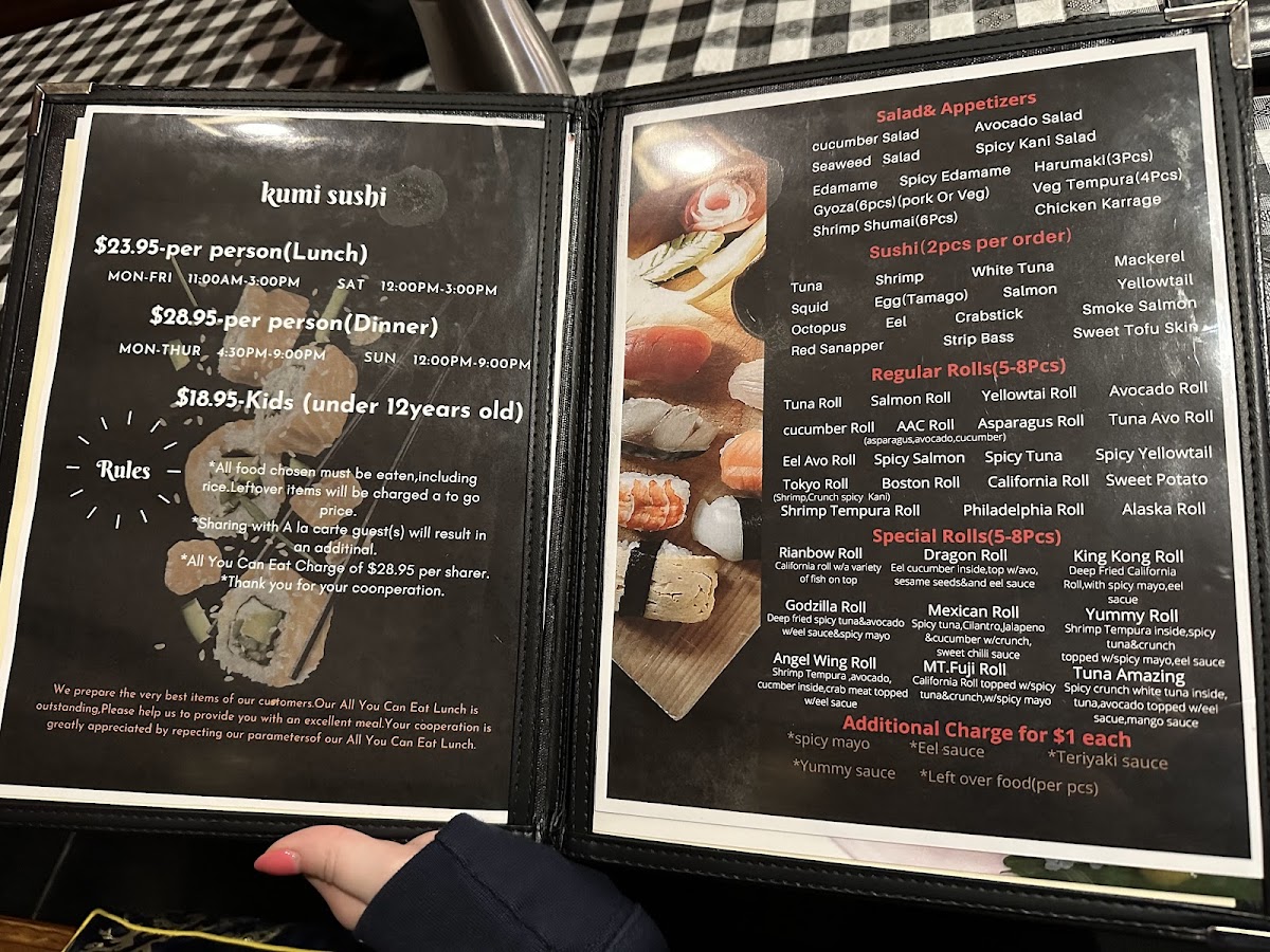 1 shrimp vege tempura 1 Rainbow Roll 1 Fujiyama Roll 1 Angel Wing Roll 2 Eel Cucumber Roll 2 Alaska Roll 2 Tuna Avo Roll