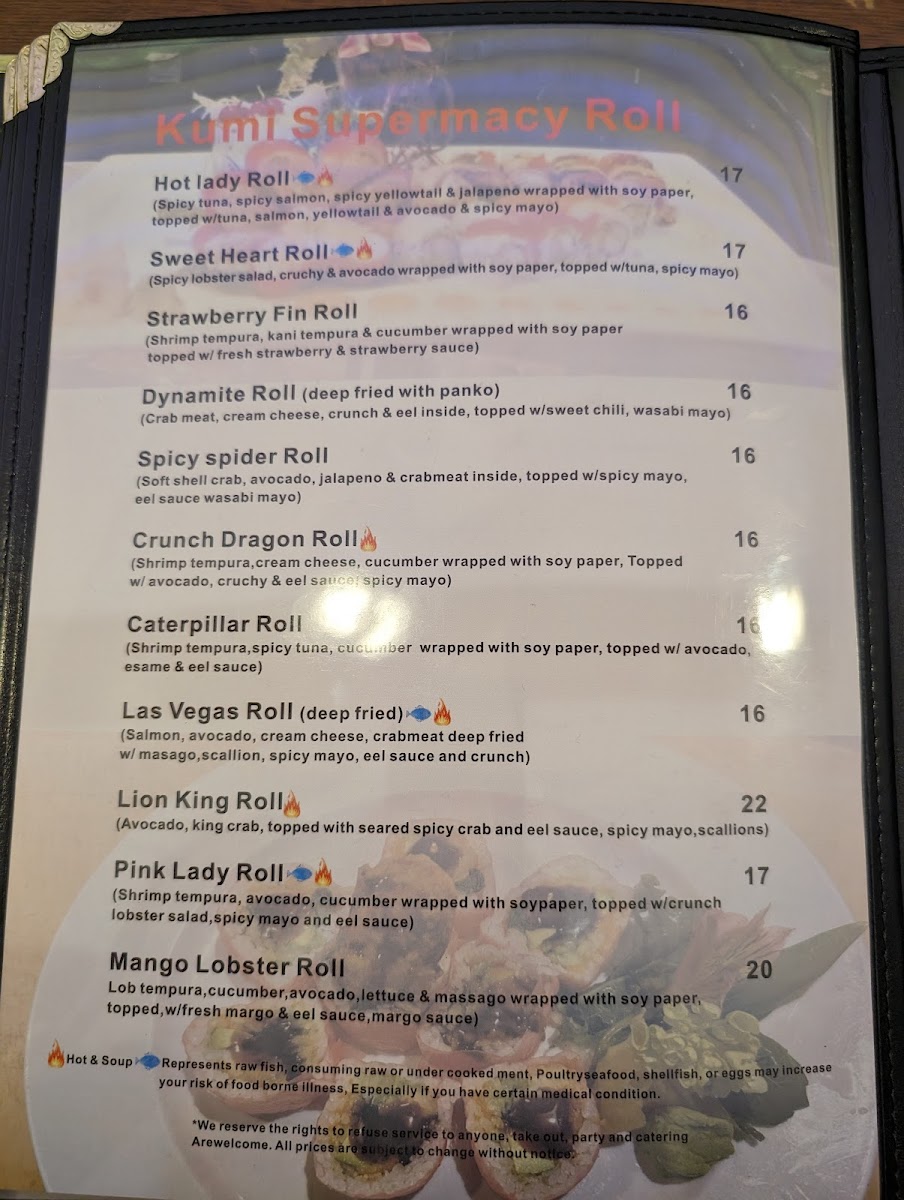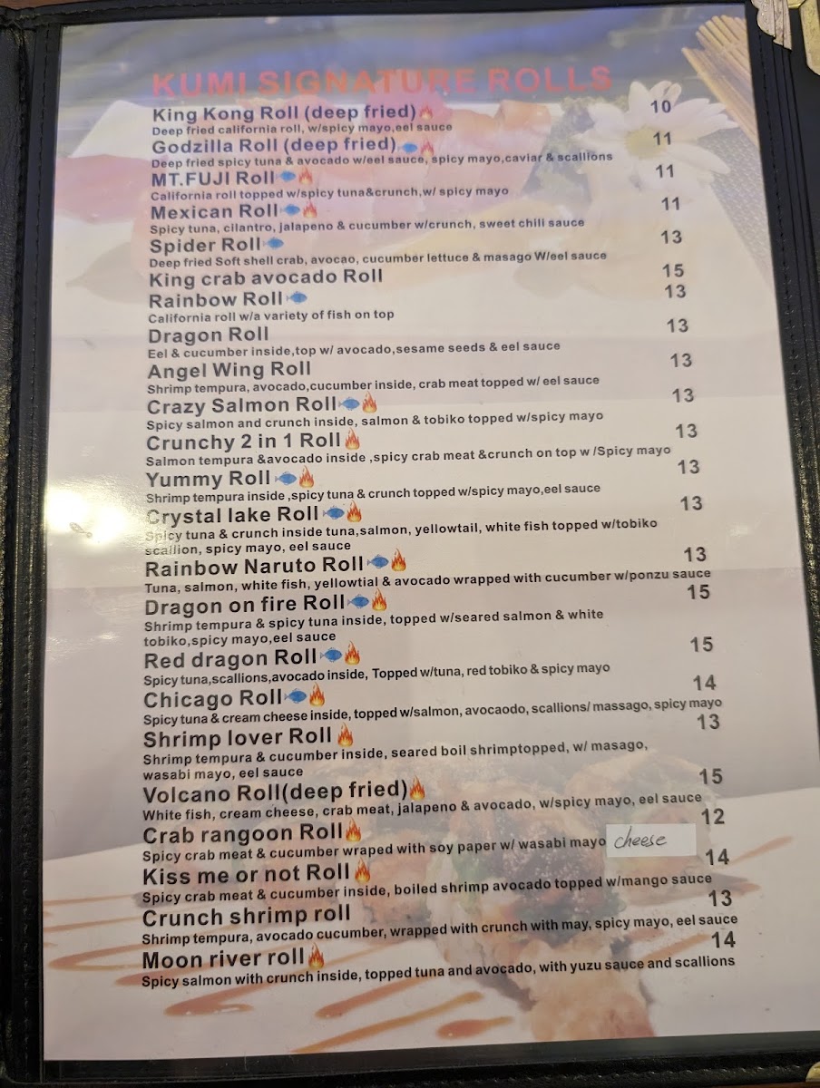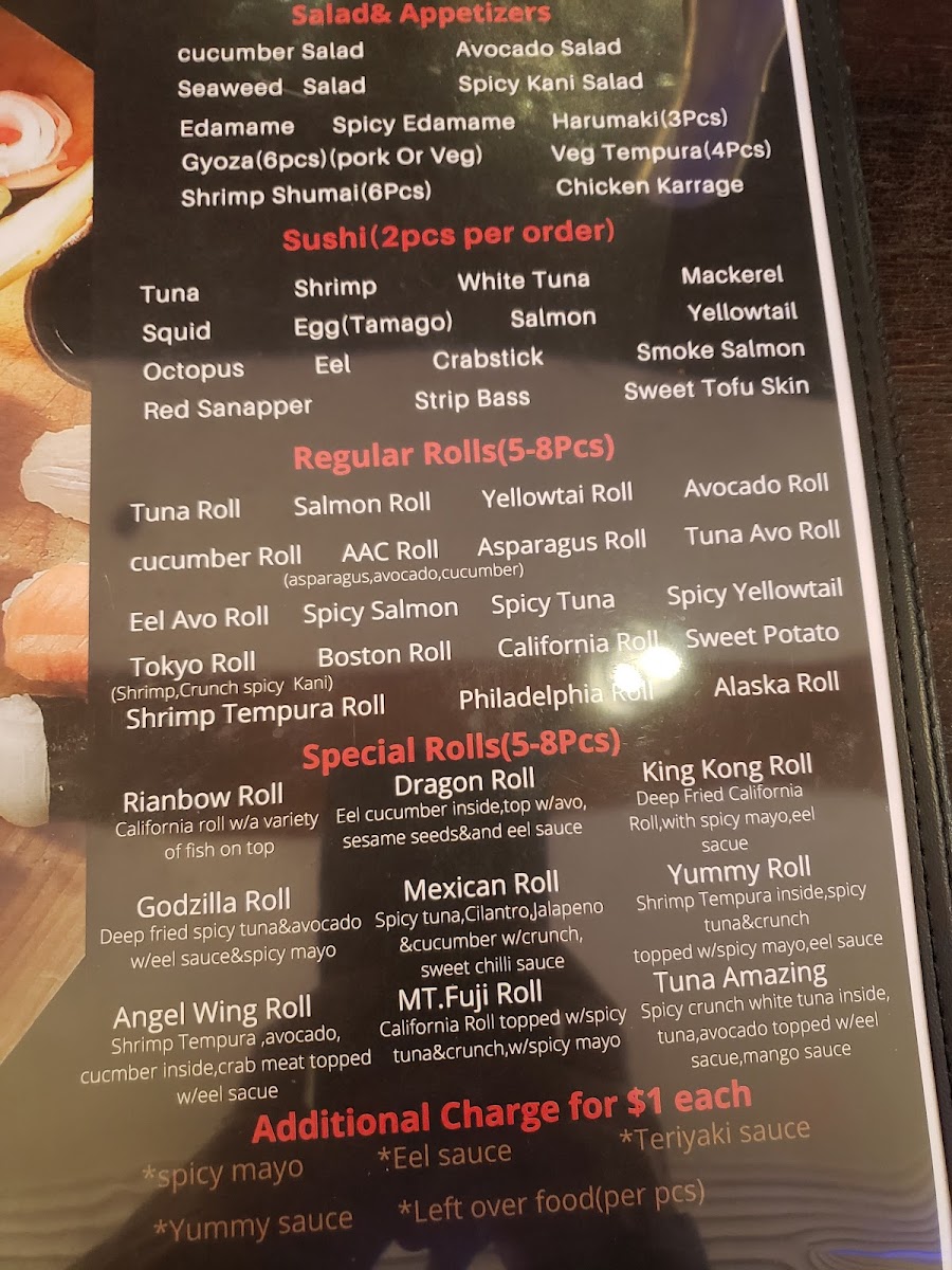 1 Mexican Roll 1 Rainbow Roll 1 Sweet Heart Roll 1 Dragon on Fire Roll 1 Yummy Roll 1 Mt. Fuji Roll 1 Shrimp Temp Roll 1 Spider Roll 1 Tokyo Roll 1 Sexy Jalapeno